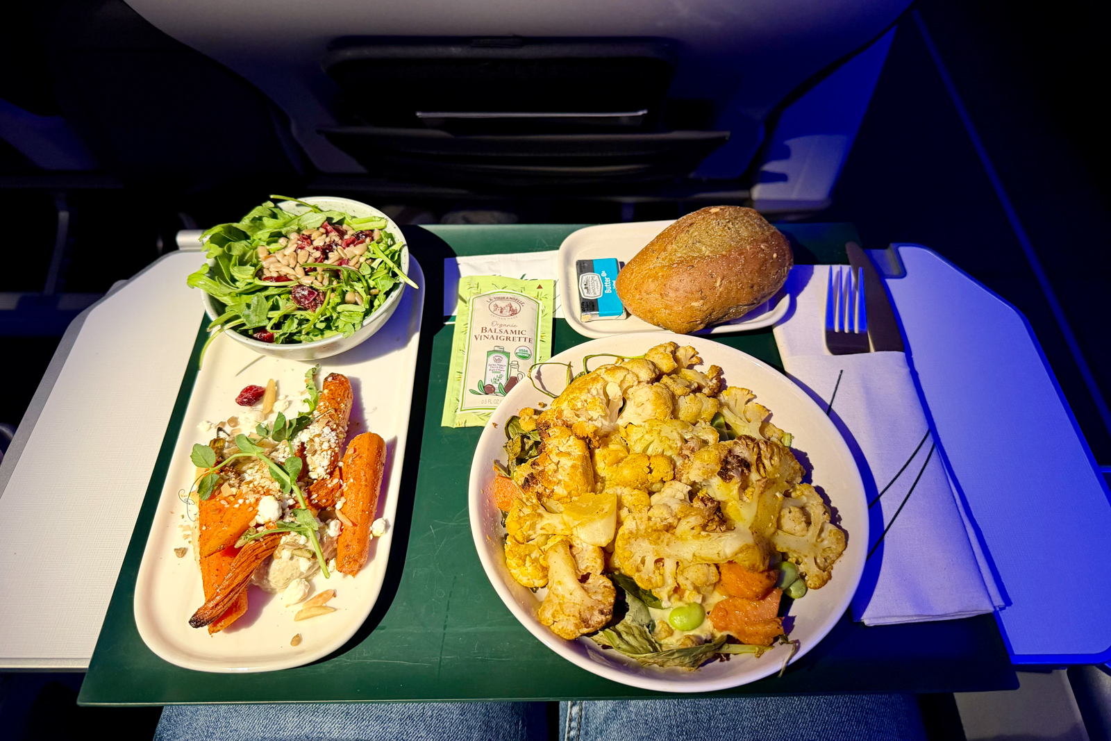 I counted way more greens than I’ve ever seen in a salad domestically on a Big 3 U.S. airline, and I thought the entree was fresh, healthy, and tasty. (For what it’s worth, both of my seatmates licked their plates clean of the chicken entree they both ordered.)
