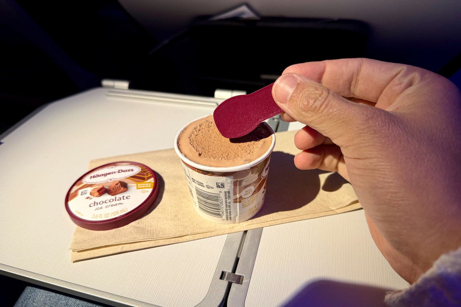 I also loved the ice cream cup for dessert on both legs (a sweet touch reserved for flights longer than 2,000 miles). Alaska typically offers Salt and Straw ice cream, but a catering shortage meant I had to suffer through a 220-calorie cup of Häagen-Dazs on my way home.