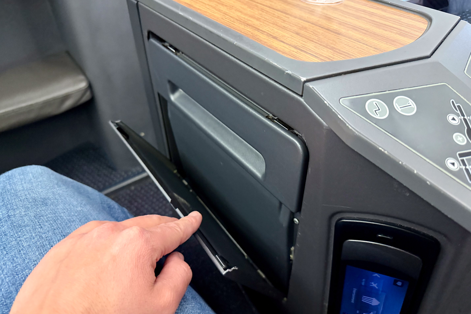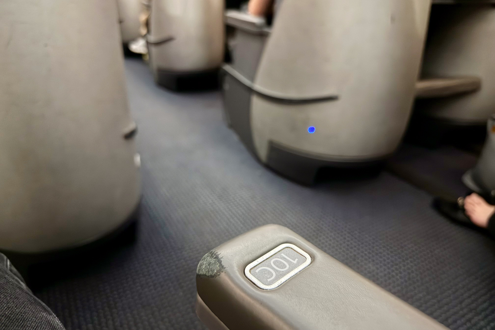 When I finally got to my seat, I was disappointed by all the visible wear and tear. Scuff marks lined the shell, the armrest was frayed, and the seat control panel was damaged.