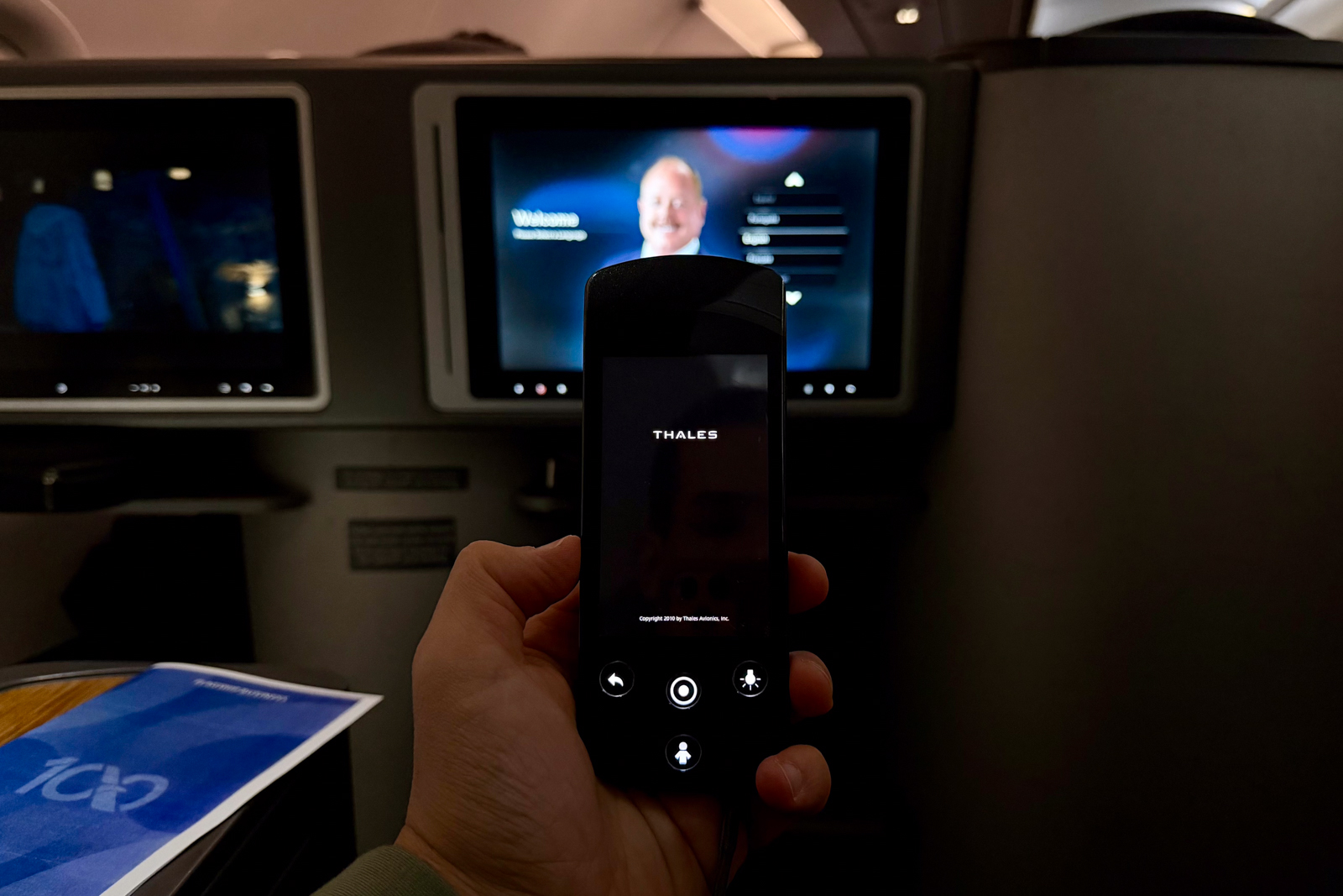 No matter how many times I tried resetting the entertainment system, my remote control stayed stuck on a black splash screen (displaying the Thales logo, the company that makes the TVs).