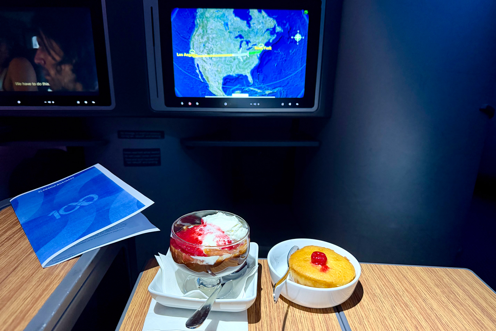 I fly this route often enough that I don’t even need to look at the menu to know what I want (pretzel rolls and the ice cream sundae, of course), but imagine the first impression this creates for someone paying $2,000 or more for their ticket.