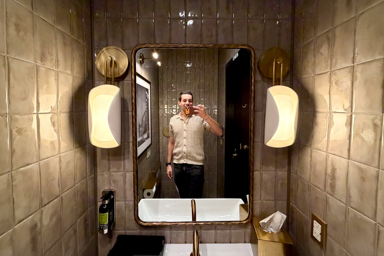 One of the most striking aspects of Sidecar is the design. Amex aimed to create an “oasis in the desert,” and the dark green tones, natural stone textures, and pops of blue help achieve that look.