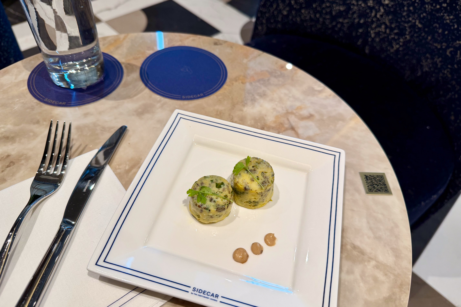 After being seated, a server will bring a menu and take your order. Alternatively, you can scan the QR code at your table and order via the Toast platform. Everything is complimentary, and Amex says tipping isn’t necessary.