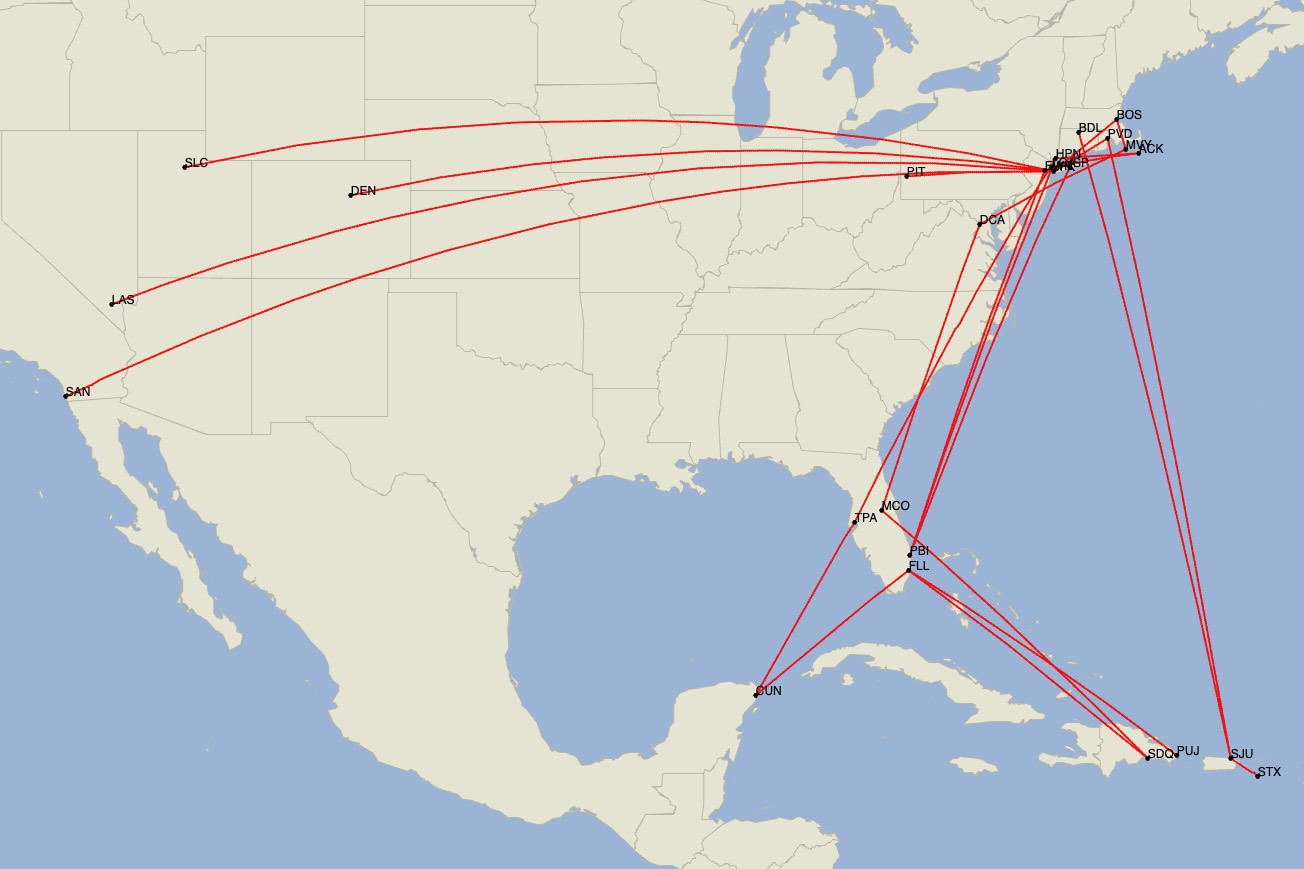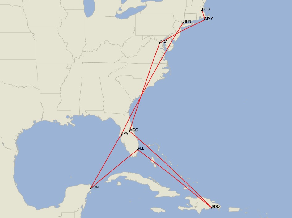 - New York → Boston → Nantucket → Washington Reagan National → Orlando → Santo Domingo → Fort Lauderdale → Cancun → Tampa → Westchester County