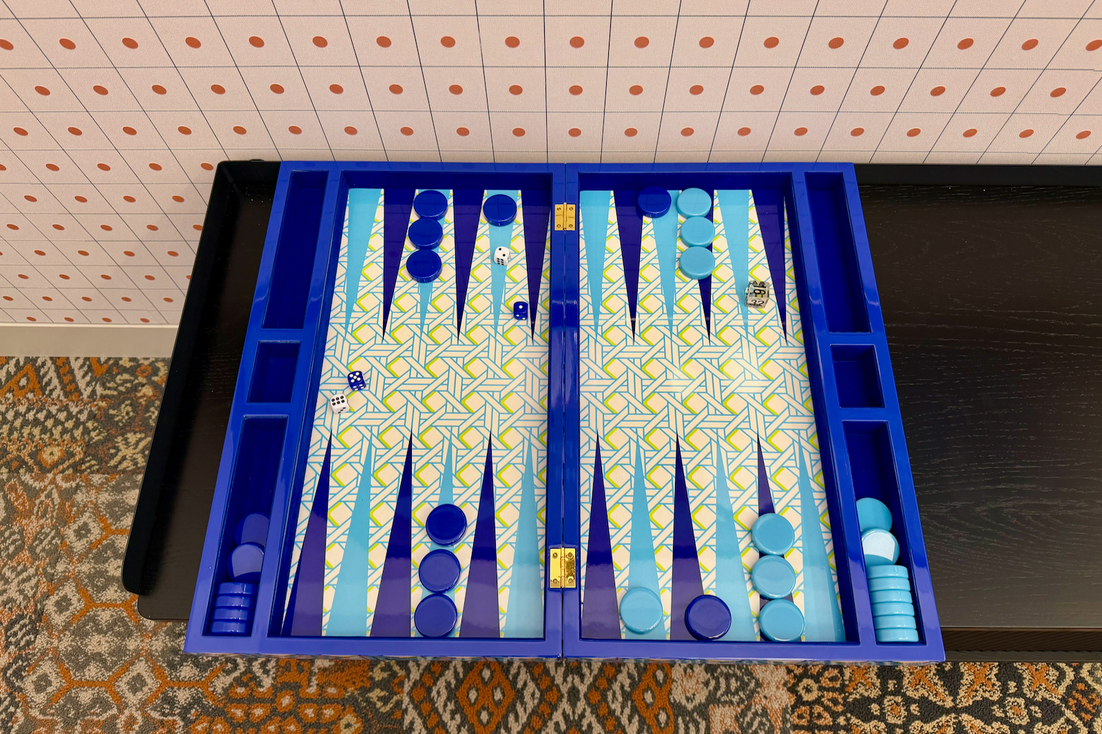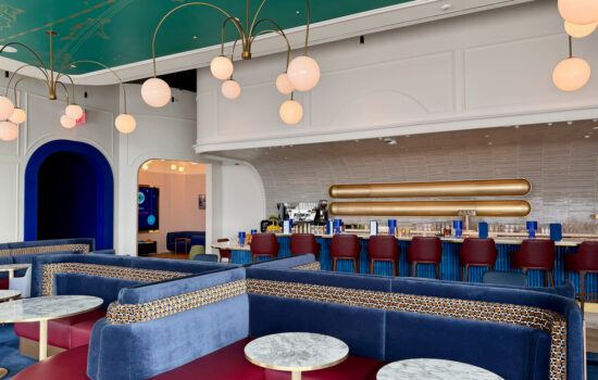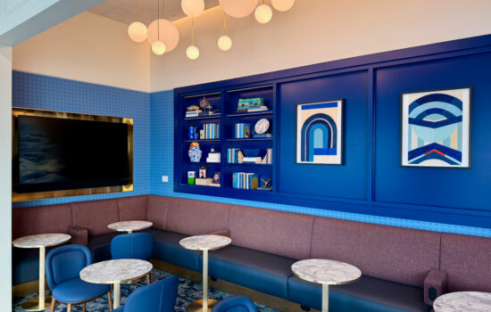 Those design principles — an apartment-style Art Deco aesthetic with blues, oranges, and brass coloring — continue throughout the space.