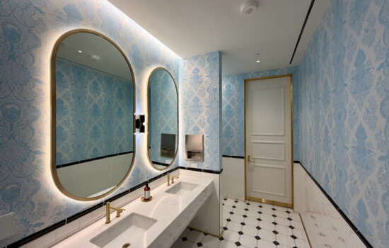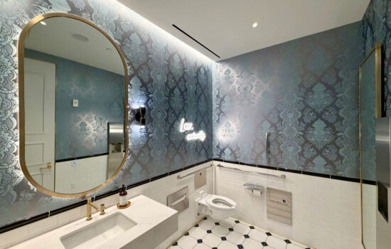 Speaking of restrooms, there are five single-use stalls on the lower level, and there are gender-specific restrooms with one urinal and one stall (on the men’s side) upstairs.