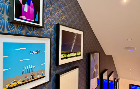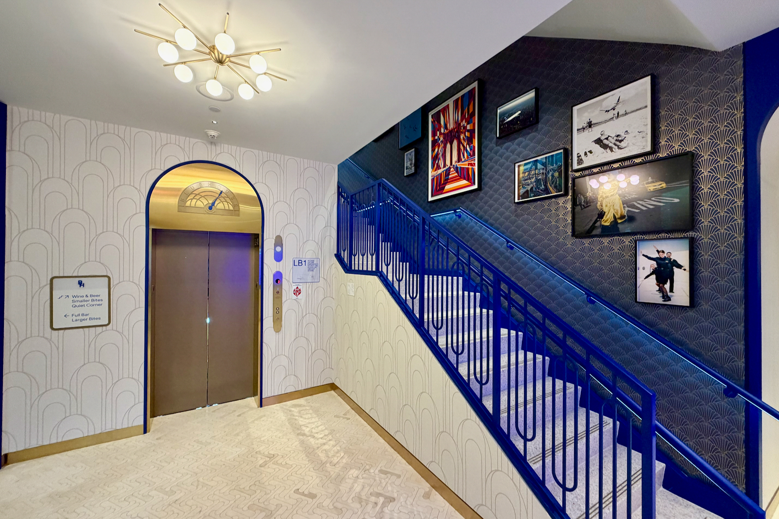 I might recommend the stairs. I love the blue patterned railing, as well as all the art that JetBlue sourced for the stairwell (and really throughout the lounge).