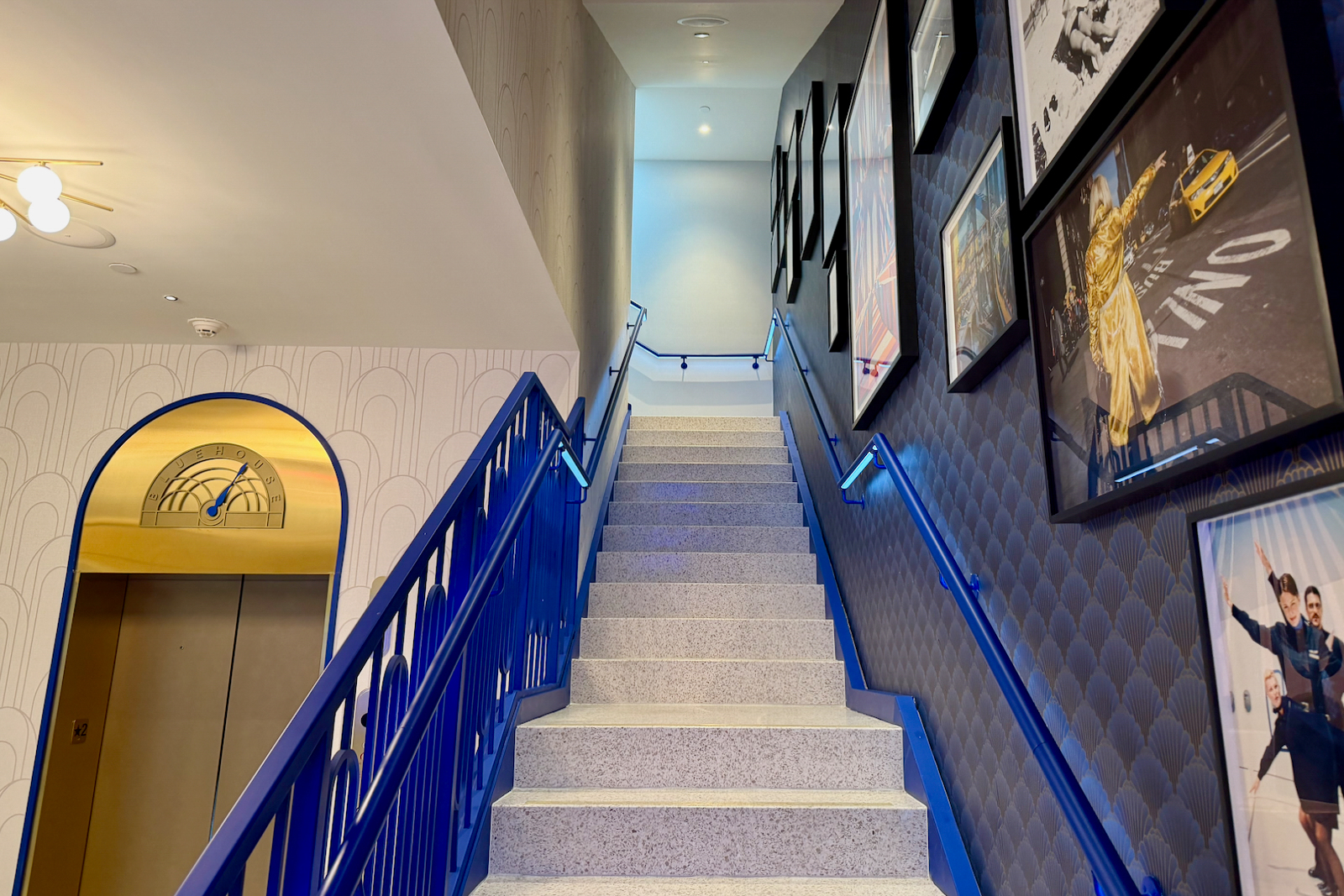 To get upstairs, you can take the elevator (adorned with a retro-style floor indicator embossed with BlueHouse branding) or the stairs.