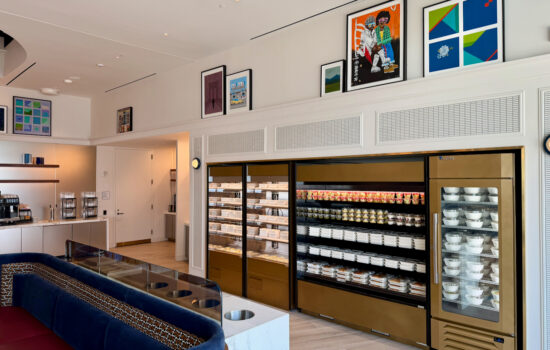 Coffee is from Joe Coffee, chai and matcha are from Brooklyn’s Dona, and teas are from Steven Smith Teamaker.