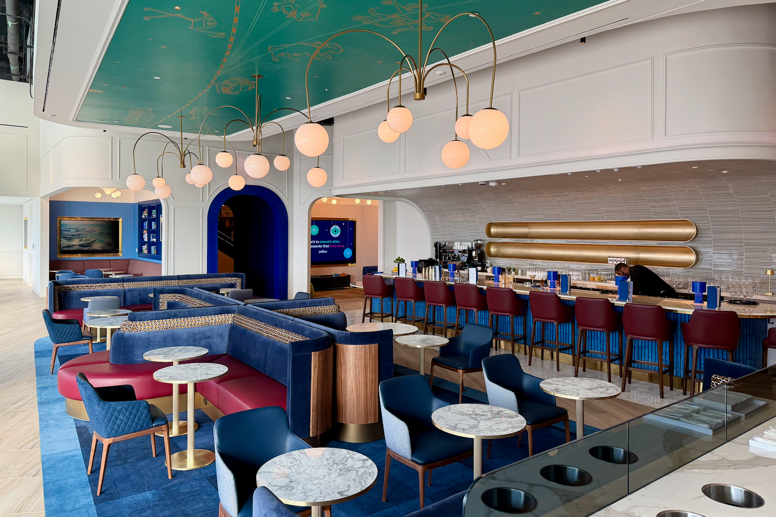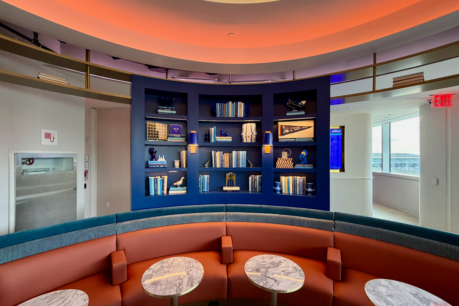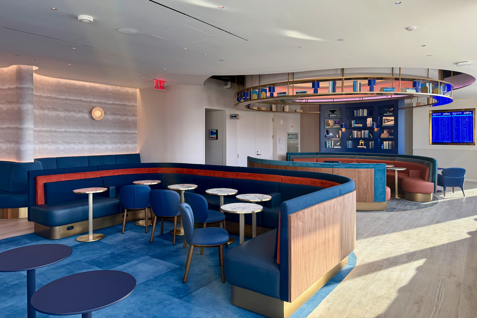 From its New York–inspired design to its two-story layout and bold color palette, the lounge feels distinctly JetBlue while offering a cozy retreat from the chaos of Terminal 5.