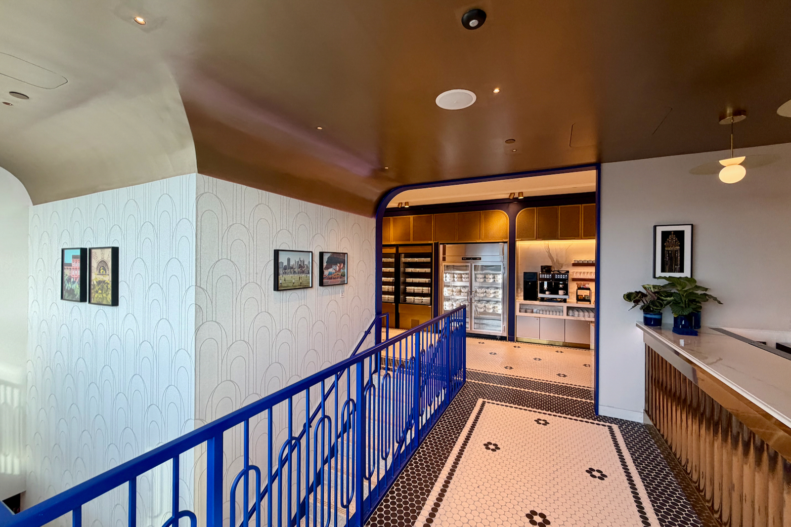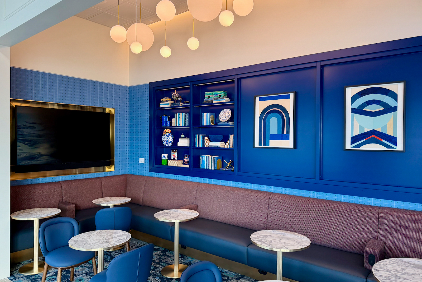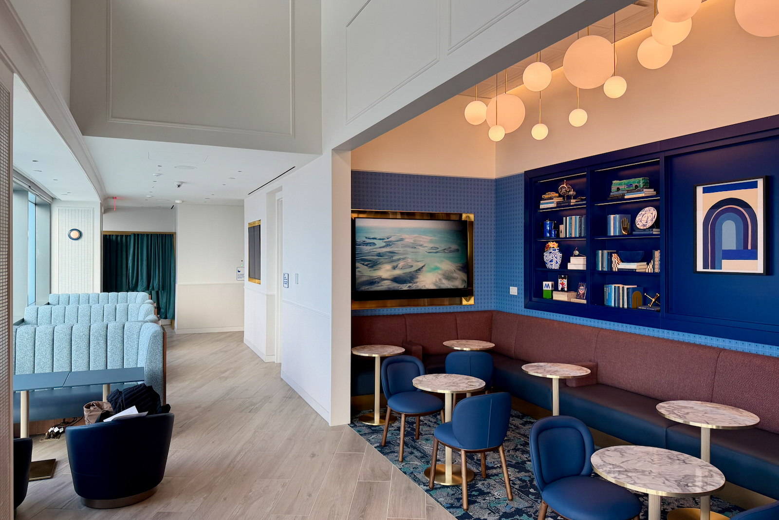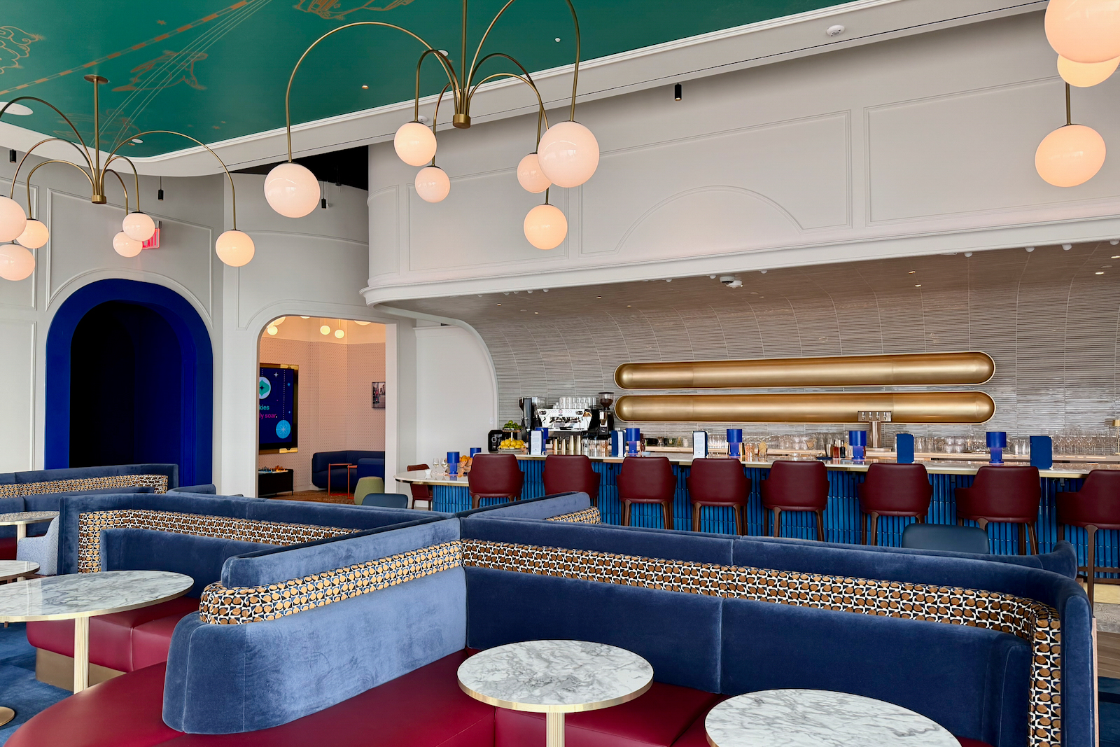 Those design principles — an apartment-style Art Deco aesthetic with blues, oranges, and brass coloring — continue throughout the space.