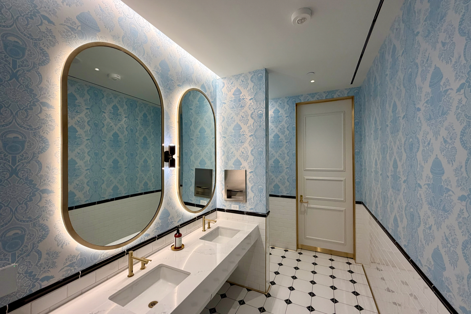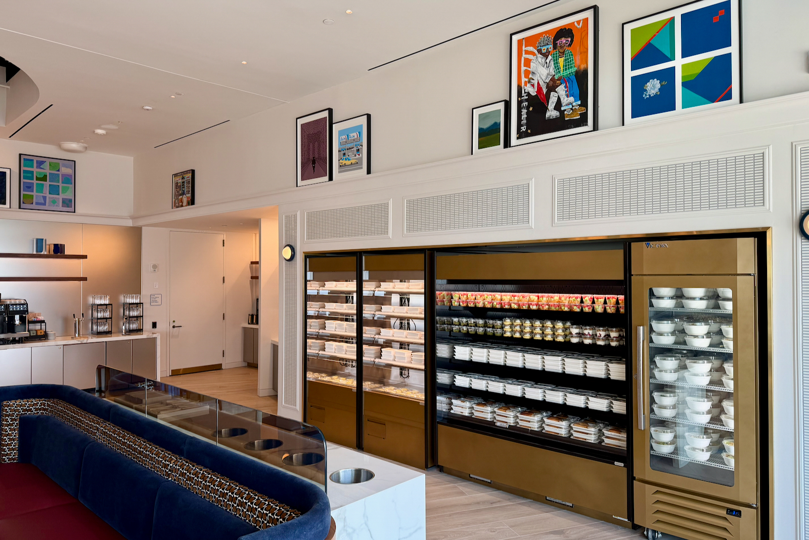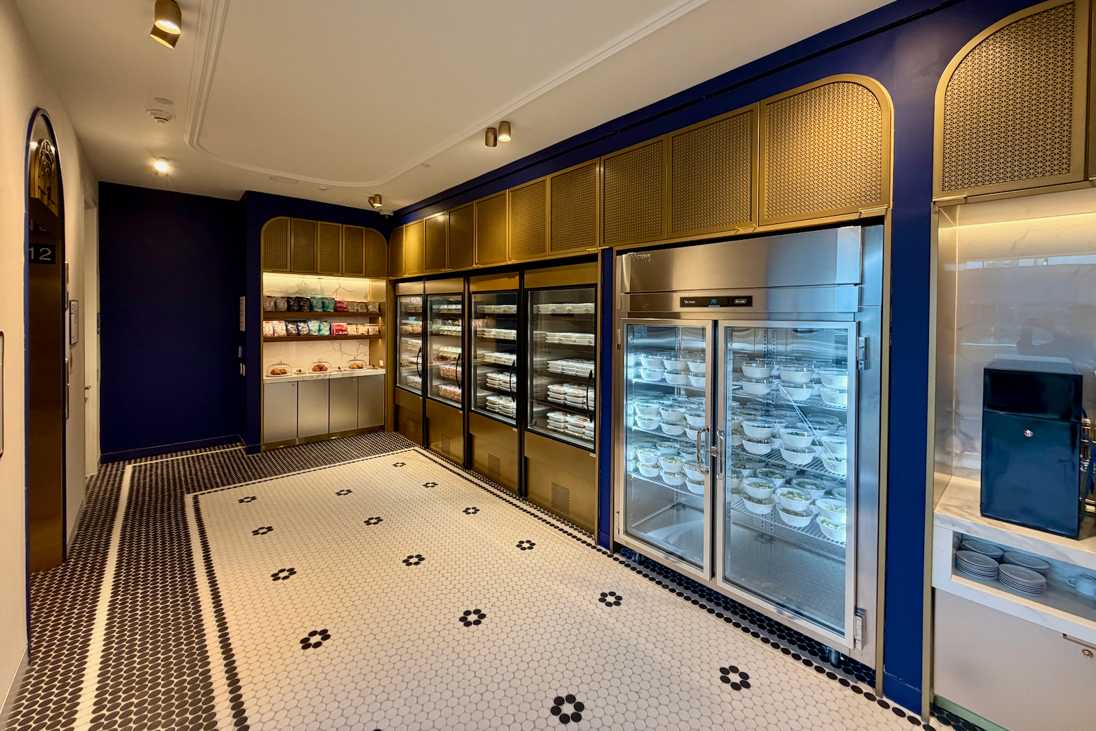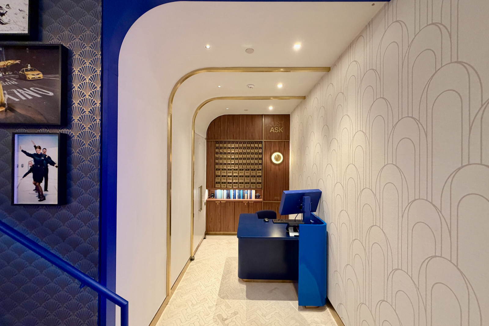 Those design principles — an apartment-style Art Deco aesthetic with blues, oranges, and brass coloring — continue throughout the space.
