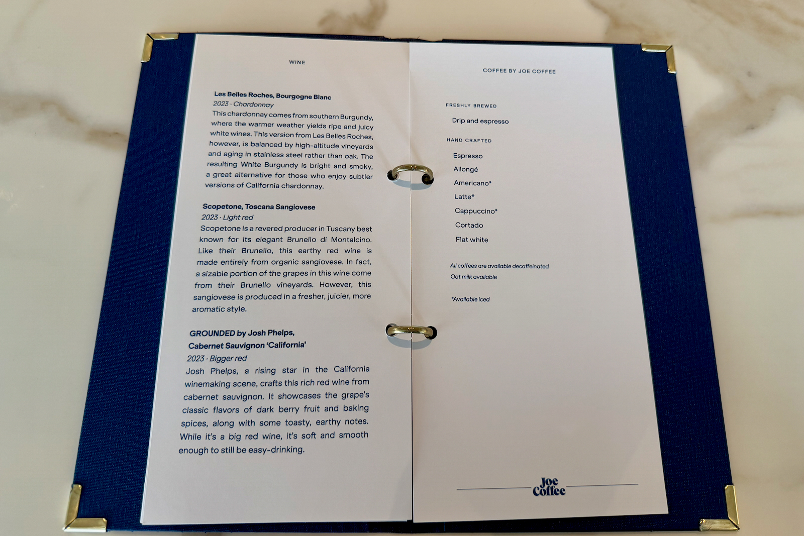 Coffee is from Joe Coffee, chai and matcha are from Brooklyn’s Dona, and teas are from Steven Smith Teamaker.