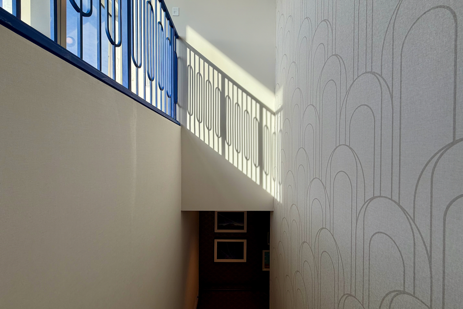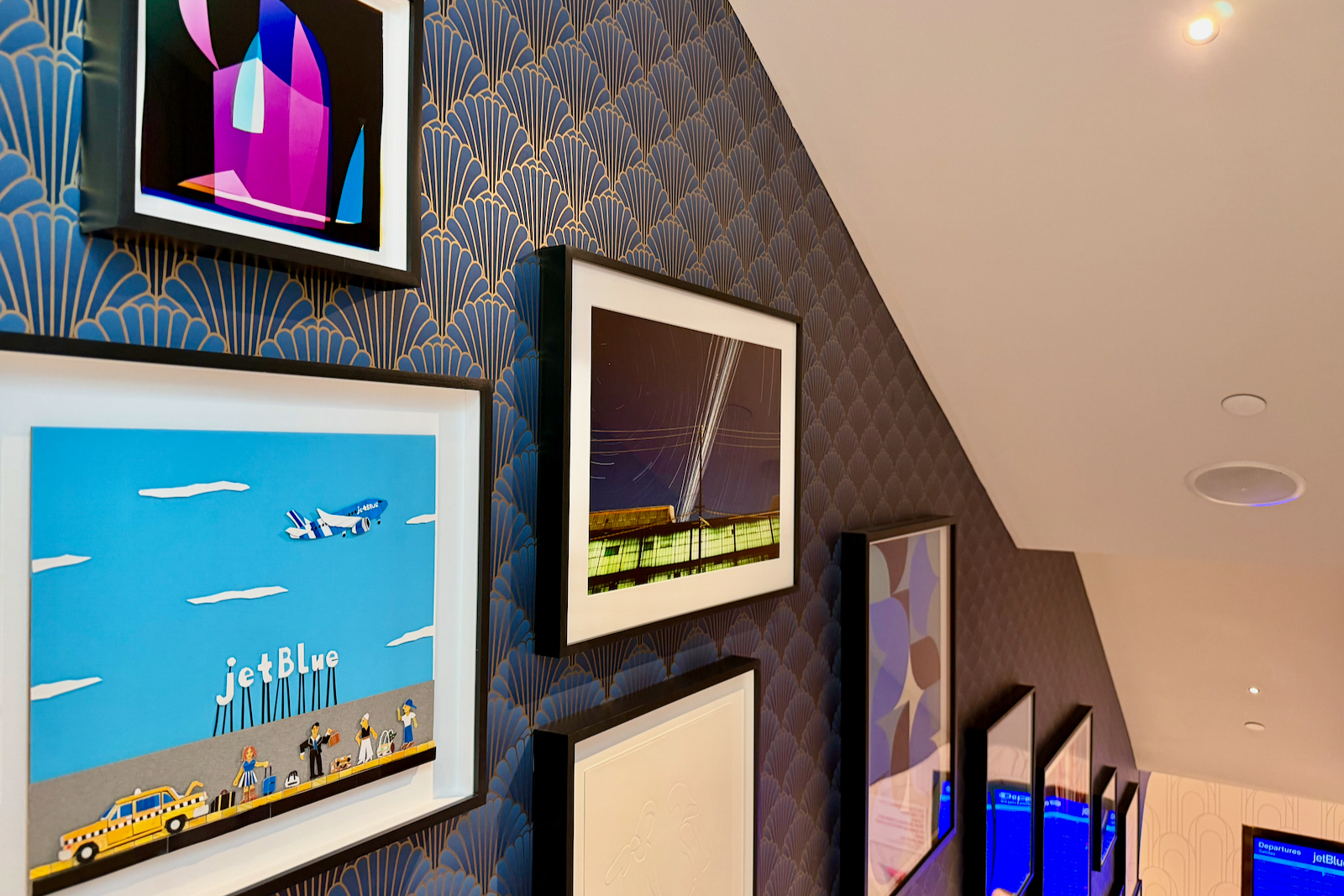 I might recommend the stairs. I love the blue patterned railing, as well as all the art that JetBlue sourced for the stairwell (and really throughout the lounge).