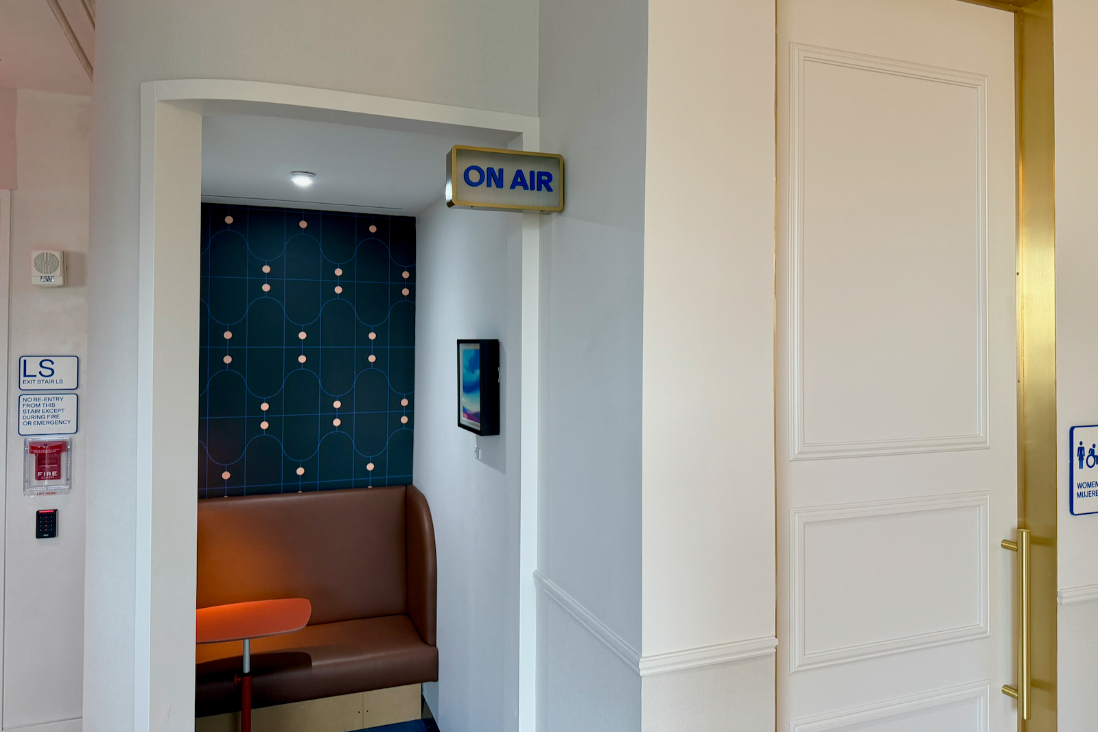 For one, there are two phone booths (without sliding doors) on the upper level. The “on air” sign outside of them will automatically illuminate when someone is sitting inside.