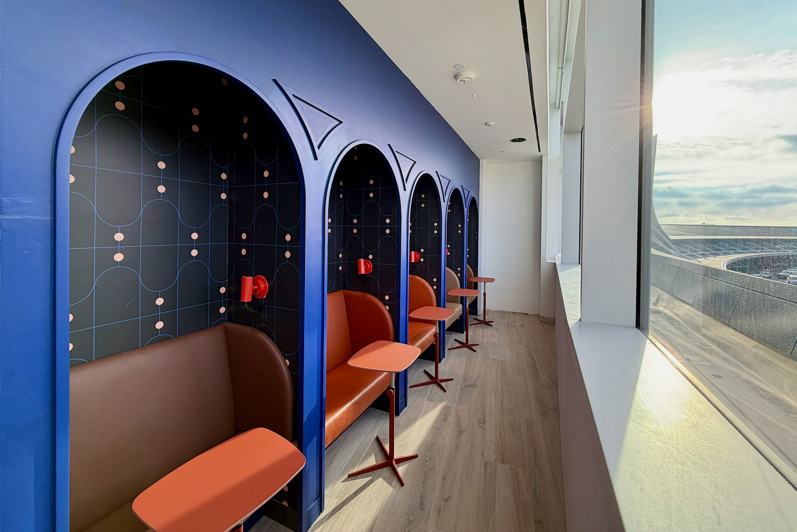 Unlike the frosted windows downstairs, the upper level features clear views of Terminal 5’s departure curb and the TWA Hotel.