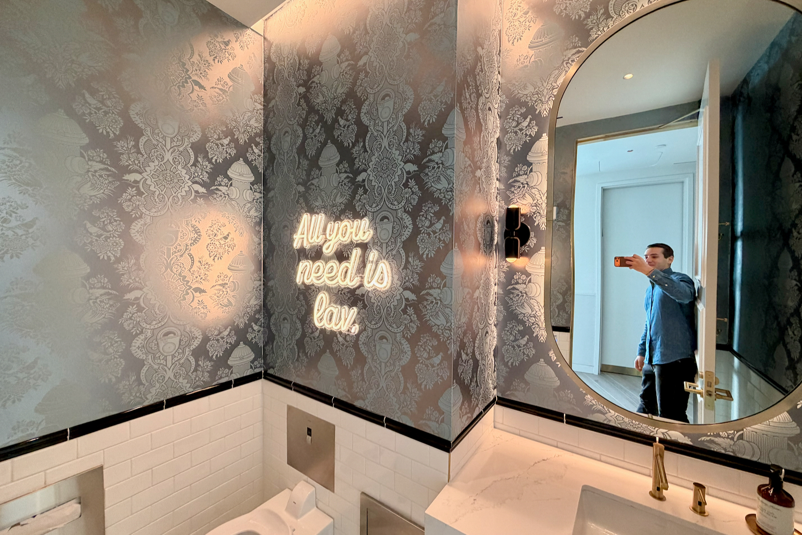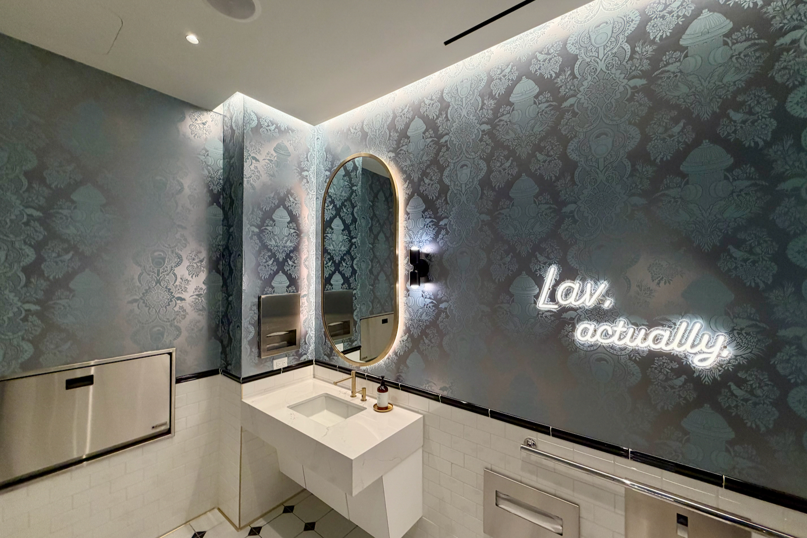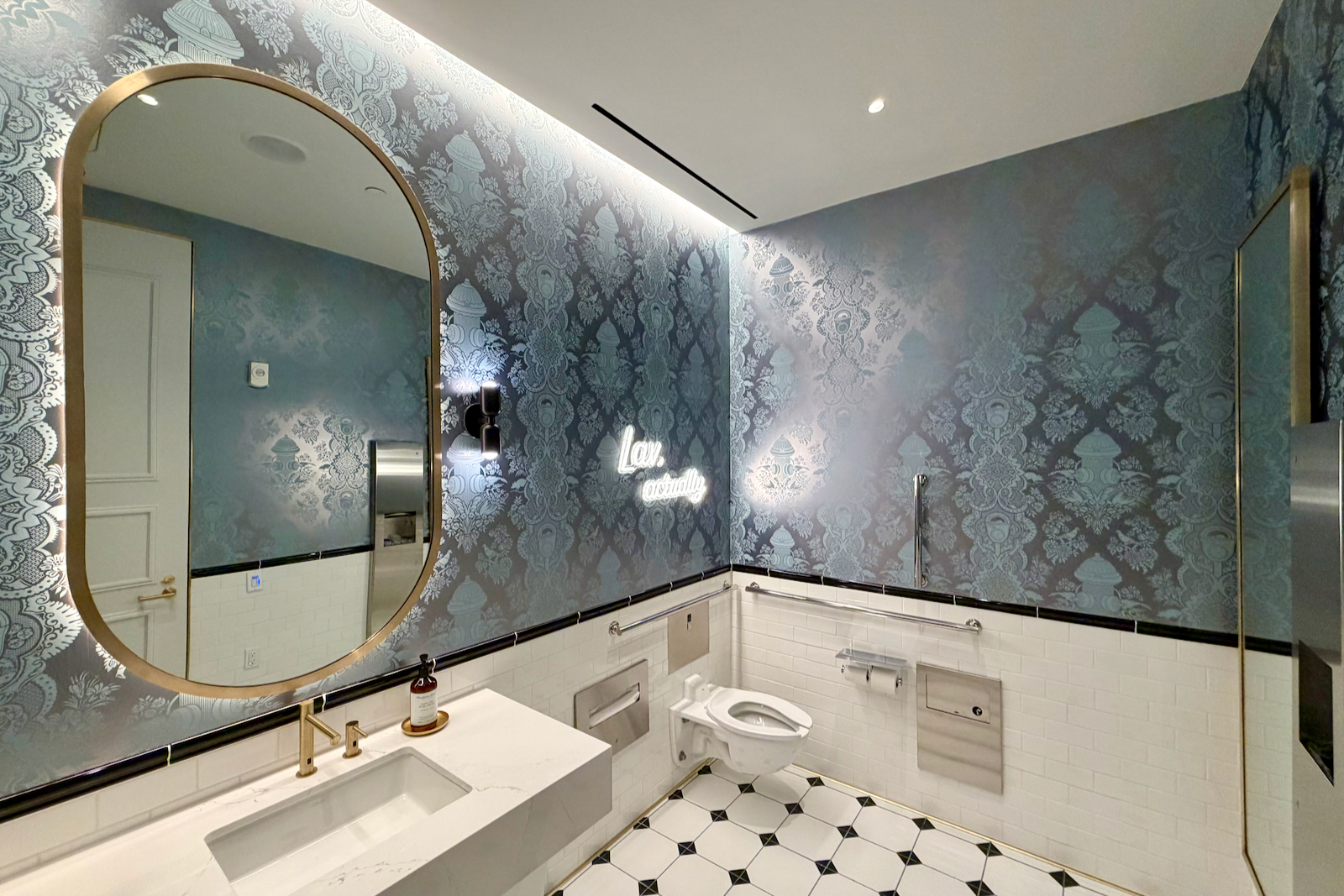 I loved the bathroom design — it might not’ve felt as luxe as a Delta Sky Club (which wants to look like a Four Seasons lobby), but they felt distinctly JetBlue. Especially the cute pithy sayings referencing the “lav.”