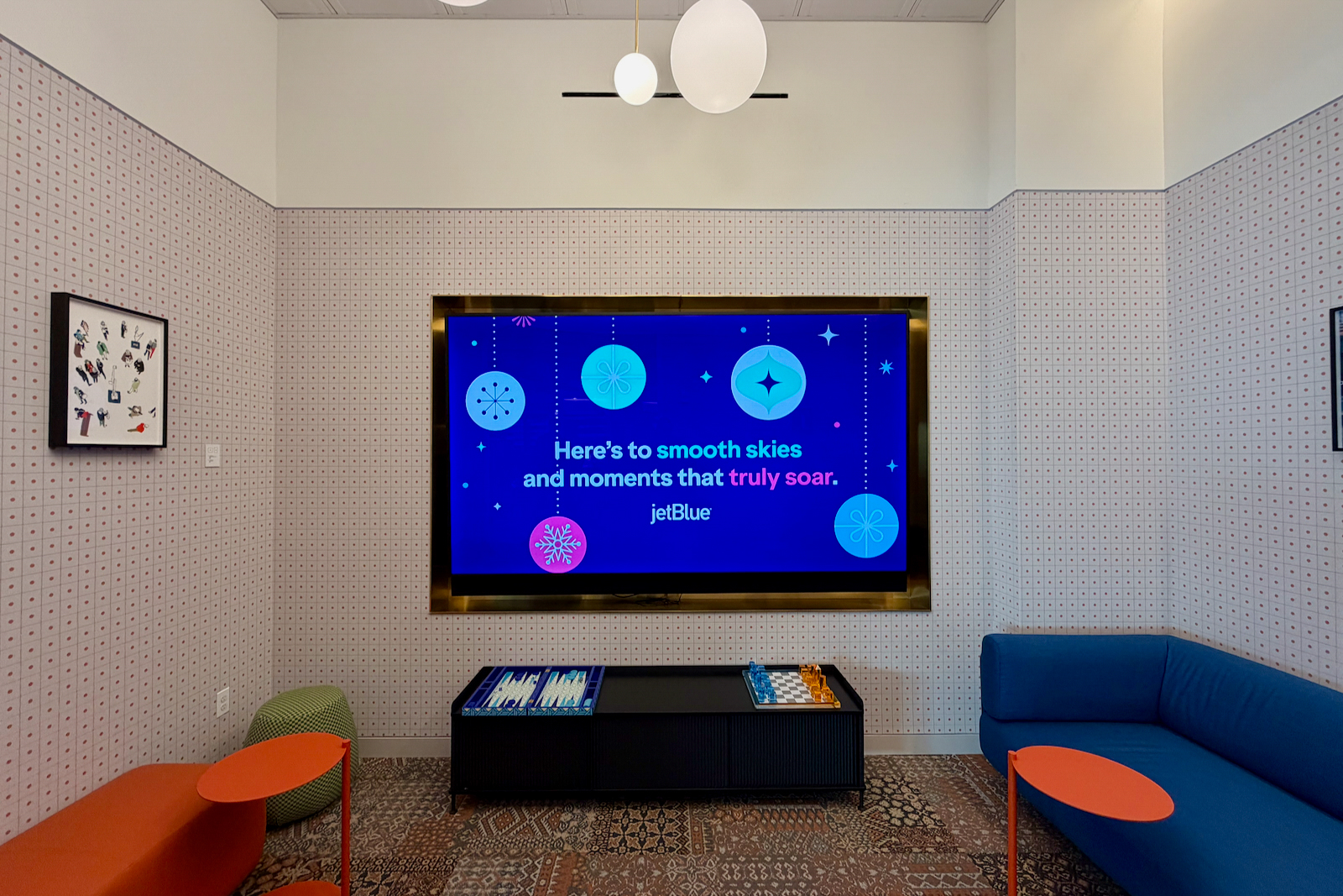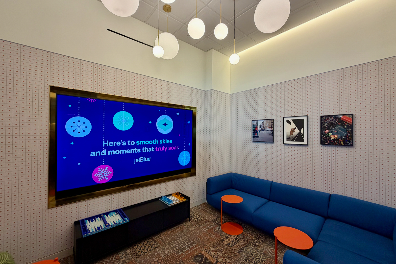 One of them is for the game room, which features JetBlue-colored checkers and chess games, playing cards, and a large TV.
