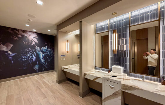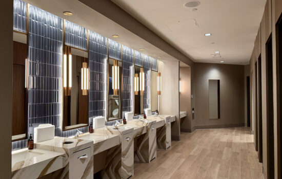 Restrooms flank the reception area, and they’re arguably the nicest in the airport. Just look at all the marble Delta used in the design.