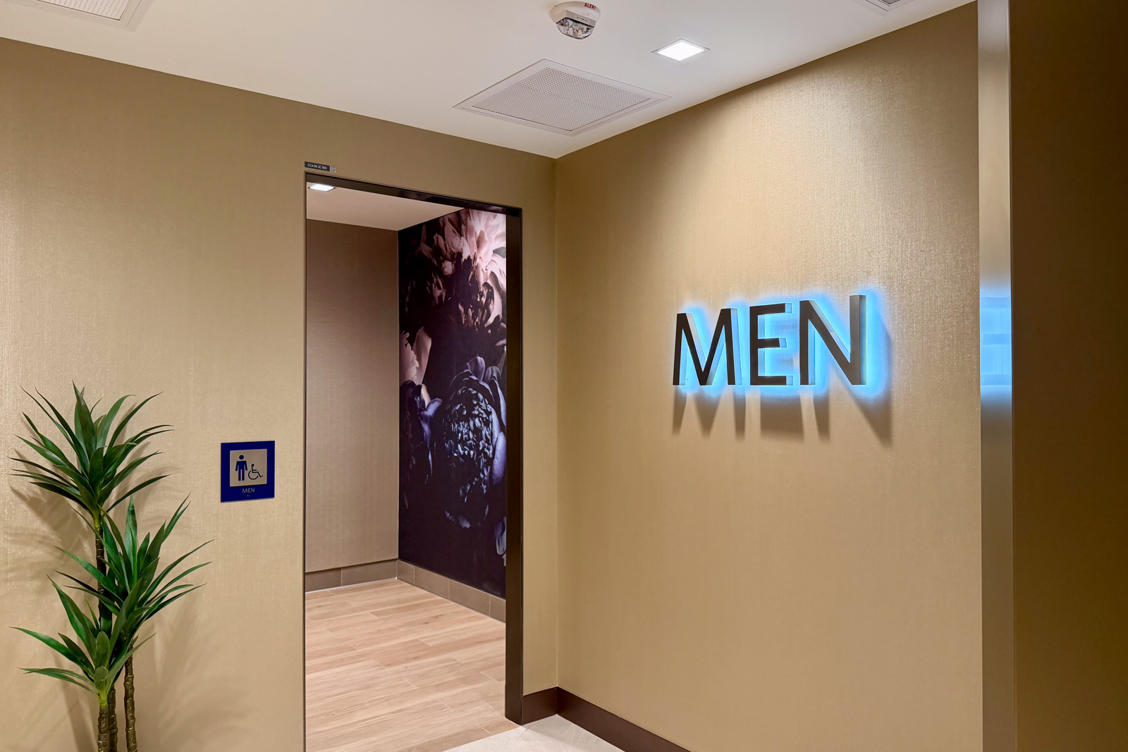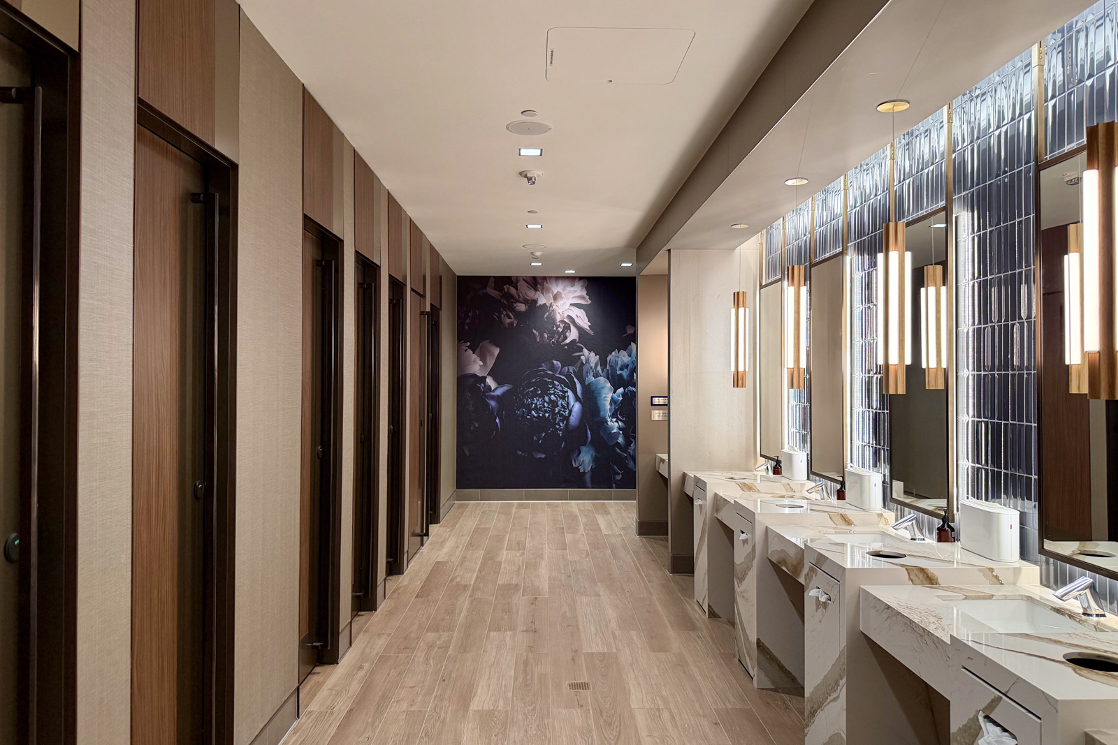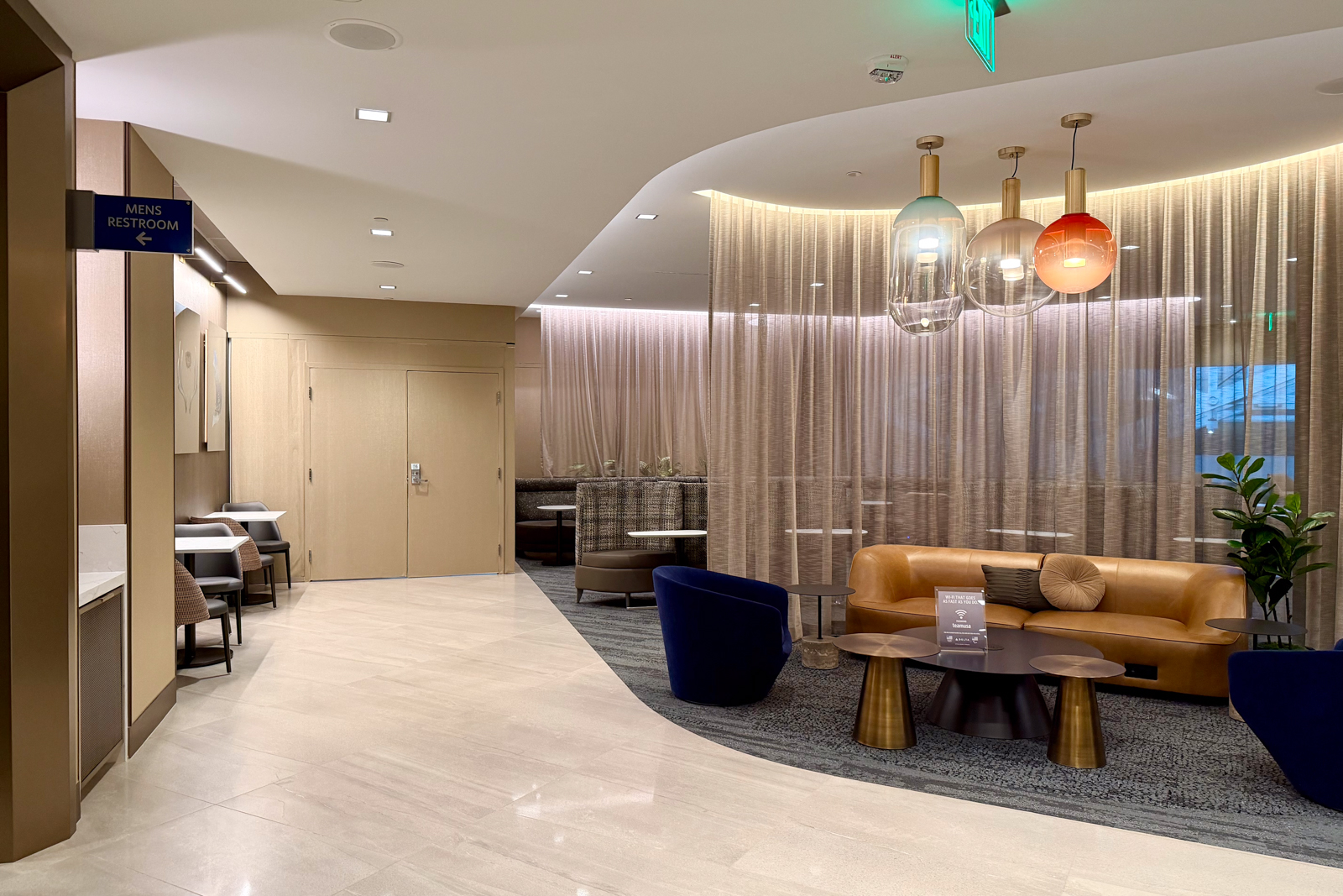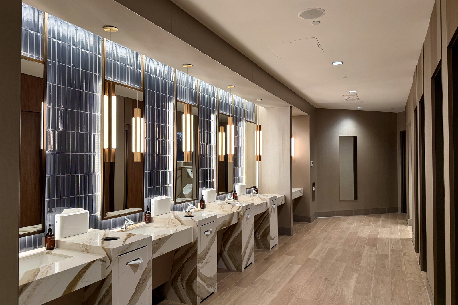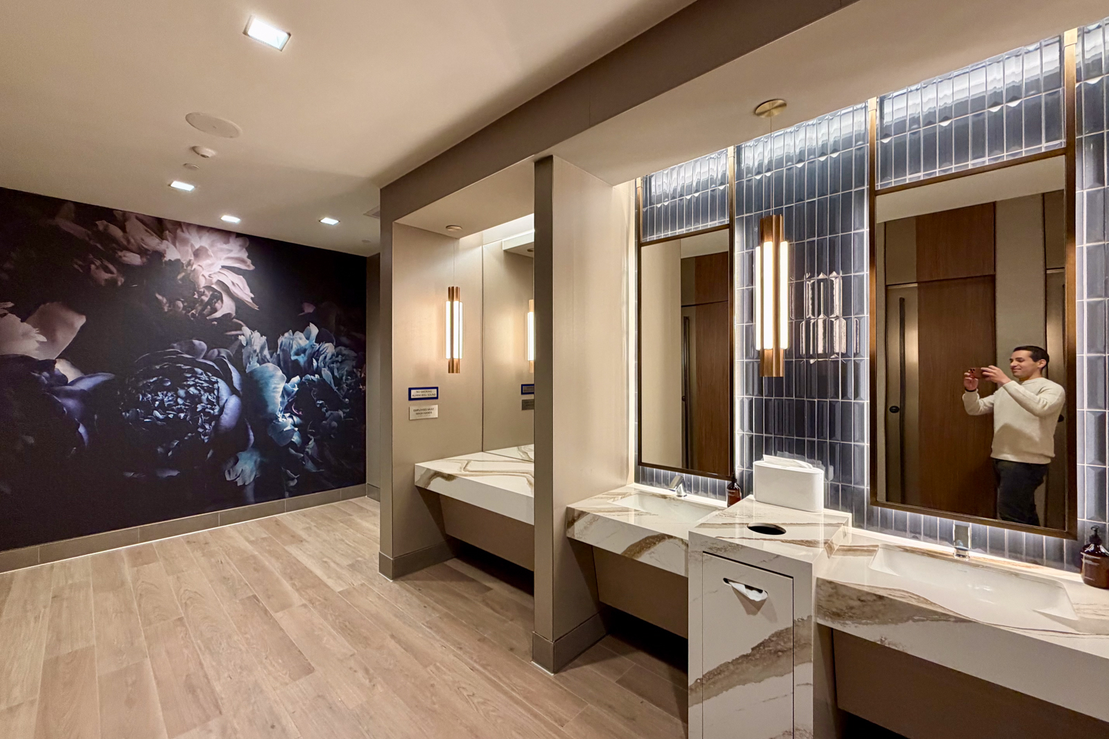 Restrooms flank the reception area, and they’re arguably the nicest in the airport. Just look at all the marble Delta used in the design.
