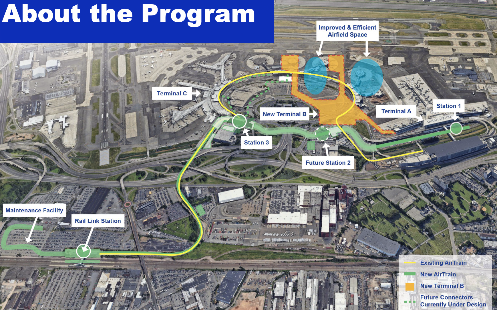 The new AirTrain will operate on an entirely new route within the airport. There will be three stations: one for Terminal A, one for Terminal B, and another for Terminal C — all at different locations from the existing AirTrain.