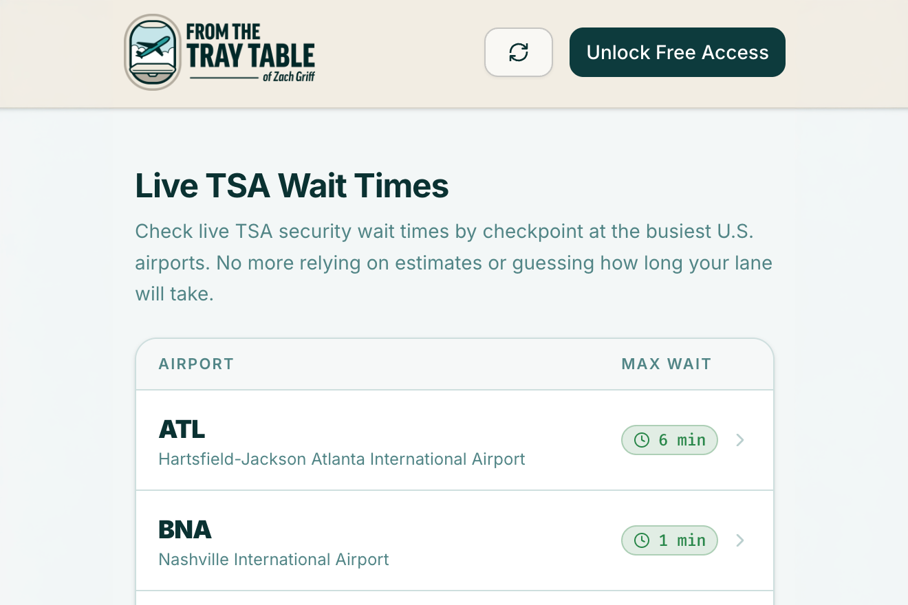 Live TSA wait times for 30+ major U.S. airports, broken down by checkpoint-level data.
