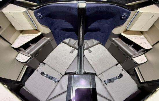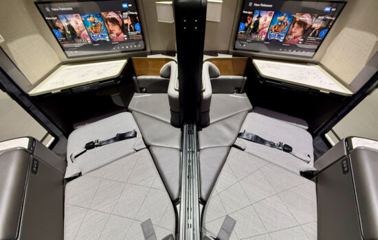 Another standout feature is the layout of the center seats. In the forward Polaris cabin (rows 1 through 8), the center seats angle toward each other. In the rear cabin (rows 9 through 17), the center seats angle away from each other — a configuration that enables the first-ever double bed in Polaris.