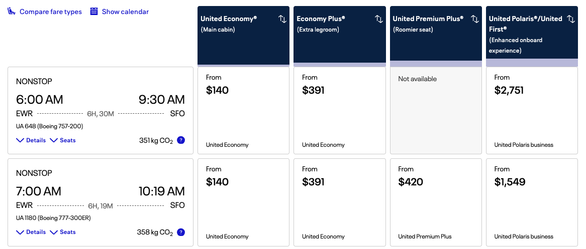 The eligible premium transcon routes include Newark to Los Angeles and San Francisco. Long-haul flights to Hawaii from Chicago and Newark are also now sold as Polaris.